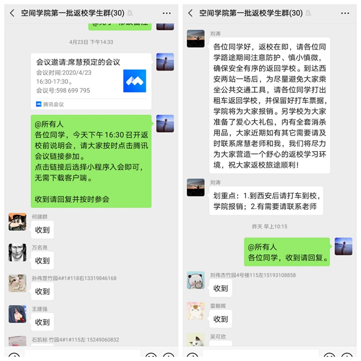 为免除员工返校的后顾之忧,空间学院通过在线方式反复叮咛员工返校途中注意安全、慎小慎微,请员工避免乘坐公共交通工具并由学院报销返校出租车费用;准备消杀用具和日常用品,将学校、学院爱心礼包逐个送到员工宿舍,关注员工返校后个人生活情况;成立补考课程线上辅导组,每一门课程老师进行在线辅导,制定毕业设计指导方案,确保员工返校后学习生活有序进行。