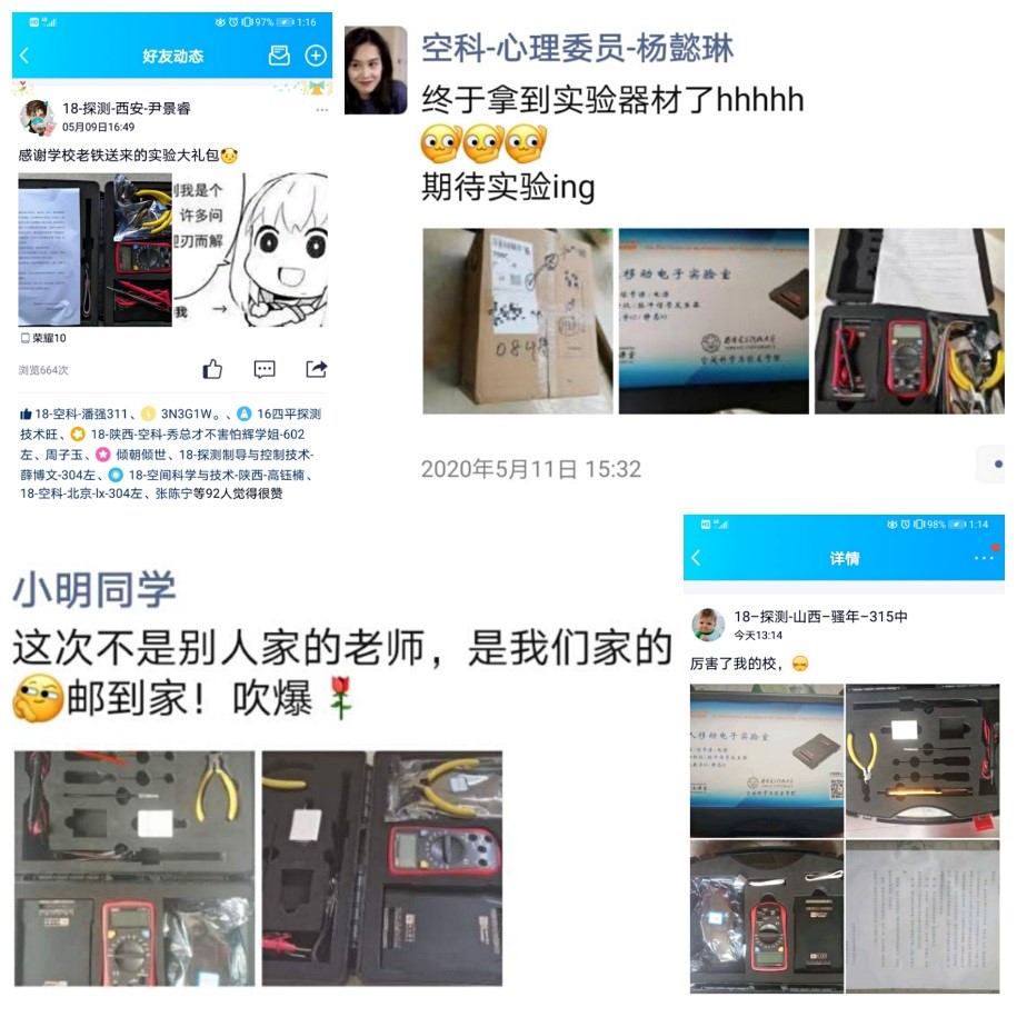 (通讯员 席慧)“厉害了,我的院!”“这次不是别人家的老师,是我们家的老师。”“邮到家,吹爆!”“终于拿到器材了,期待实验ing”……5月10日,tyc539太阳集团2017级、2018级员工们的朋友圈洋溢着满满的自豪、兴奋和感动。一份份满载着老师们谆谆关怀和同学殷切期待的“个人移动实验室”,跨越过千山万水,背负着特殊使命,在“停课不停教、停课不停学”的特殊时期抵达了员工们手中。截止5月底,空间学院员工已经使用“个人移动实验室”在圆满完成了3次远程实验课,线上、线下相结合的教学模式助力各项实践训练稳步推进。