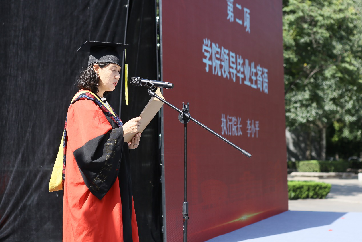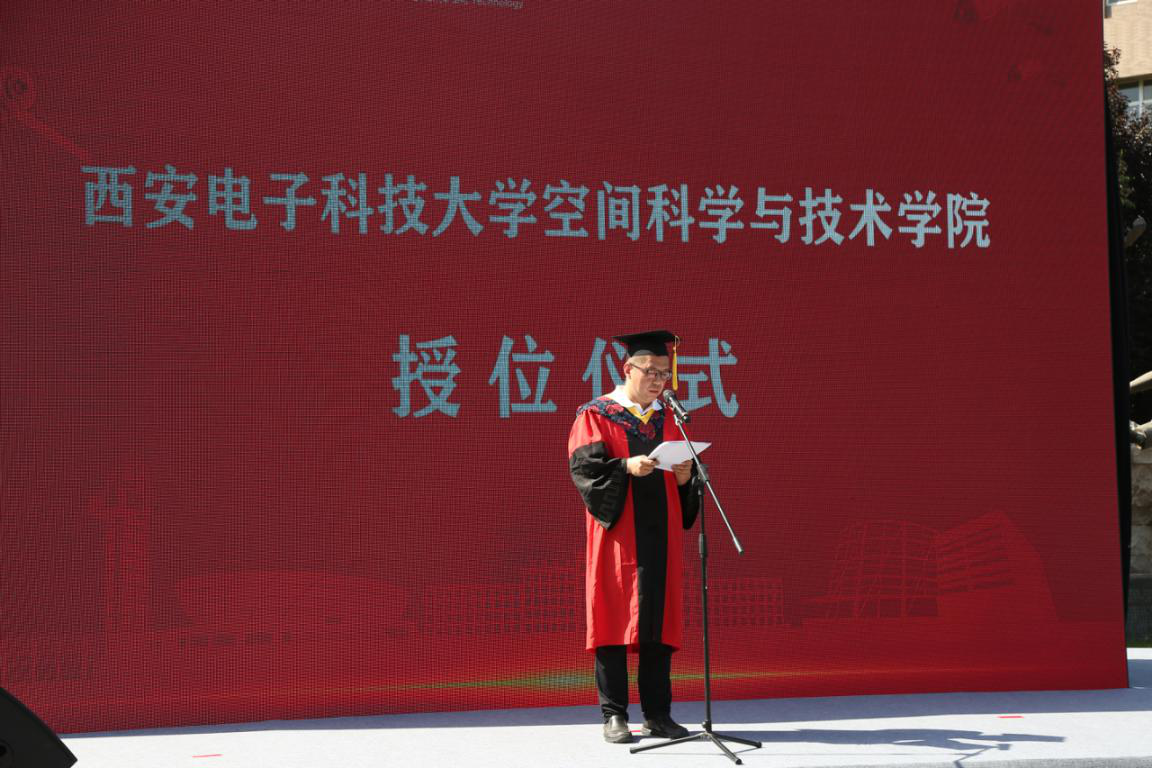 国歌声落,在庄严肃穆的氛围中,李小平教授为毕业生送上临别寄语。李小平代表学院向完成学业的全体学子表示衷心的祝贺,对教师的倾心培养和学子的主动担当表示真挚的感谢。她从国家、学校、学院到个人角度给毕业生殷切寄语,第一主动应变,在世界大变局和中国崛起的变革中抓住机遇,铸就精彩人生;第二敢于创新,在瞬息万变的科技发展浪潮中引领信息科技,担当新时代西电人的使命;第三仰望星空,脚踏实地,秉承航天精神,扬帆空间科学;第四胸怀宽广,与人为善,保持纯真,做一个大写的人。
