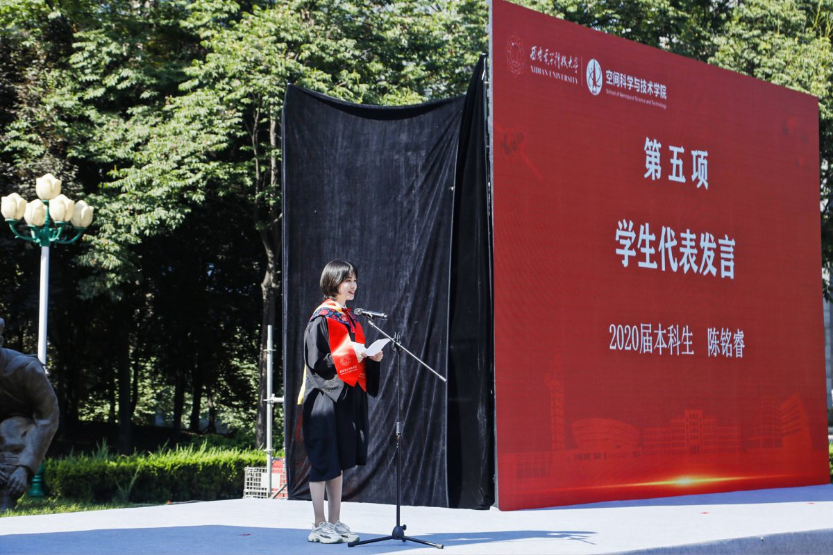 “请允许我代表tyc539太阳集团全体毕业生,向疫情期间所有奋战在第一线的逆行者致以最崇高的敬意,也向精心栽培我们的领导老师和悉心关怀我们的父母亲人,致以最衷心的感谢!”本科毕业生代表陈铭睿以“我和西电的四年之约”为题,谈及tyc539太阳集团历史性时刻和在校园各个角落的点点滴滴,并激励全体同学:“不忘‘西电红’的底色和‘三有西电人’的使命担当,认准心之所向、身之所往,与航天精神相伴,与共和国同行。”