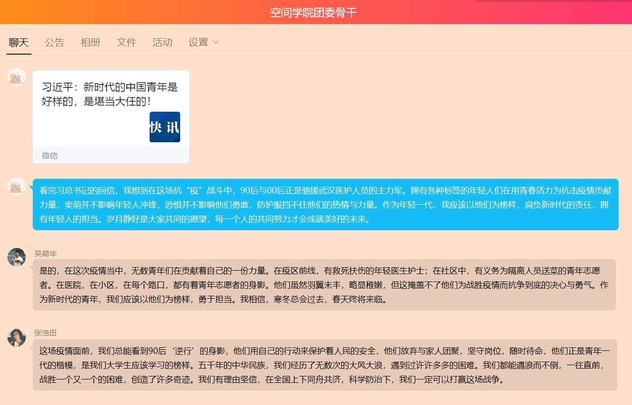 (通讯员 郑瑞博 田丽山)“新时代的中国青年是好样的,是堪当大任的!”3月15日,习近平总书记给北京大学援鄂医疗队全体“90后”党员回信,向他们和奋斗在疫情防控各条战线上的广大青年致以诚挚的问候。3月16日,空间学院团委组织全体团学骨干开展线上主题团日活动,集体学习习近平总书记回信精神并展开大讨论。