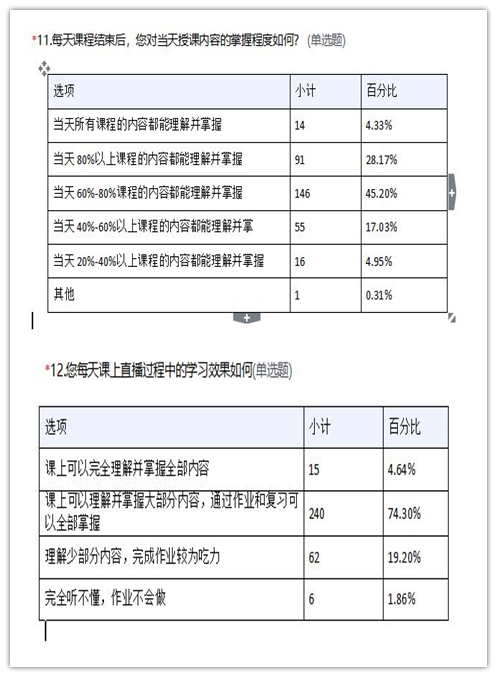 调研数据表明,绝大多数员工对学院线上教学整体满意,对老师授课方式普遍认可。网络授课改变了传统线下学习的方式和节奏,员工们可以更加高效自主的分配时间,从“面对面”到“键对键”的改变,大部分员工的积极性、主动性有所提升,员工获得感明显增强。其中,66.25%的员工每天平均花费1-2小时用于线下预习、看资料,员工在课堂上对知识的掌握程度基本在60%-80%,74.3%的员工认为通过课后作业和复习可以全部掌握,但也存在20%左右的员工尚未完全适应网络教学新生态,对线上教学过程接受程度较低。
