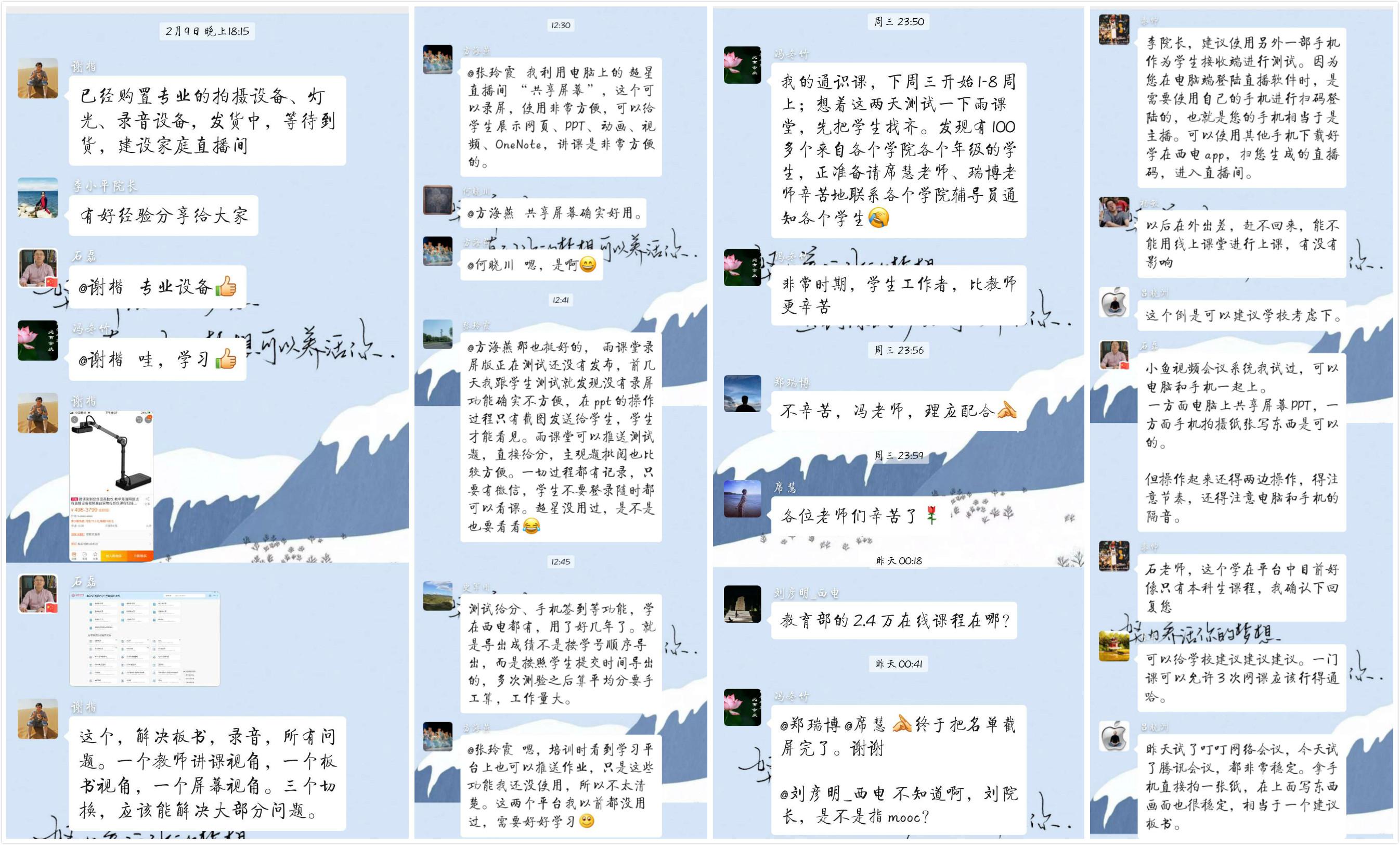 在“空间学院工作群”和“tyc539太阳集团本科教学群”中,一线教师们不舍昼夜、积极交流,你一言我一语,用最快的速度完成线上建课流程、熟悉线上教学工具、探索线上教学平台、讨论线上教学培训内容,反馈研讨线上教学测试出现的各类问题,为线上课程优化建言献策。