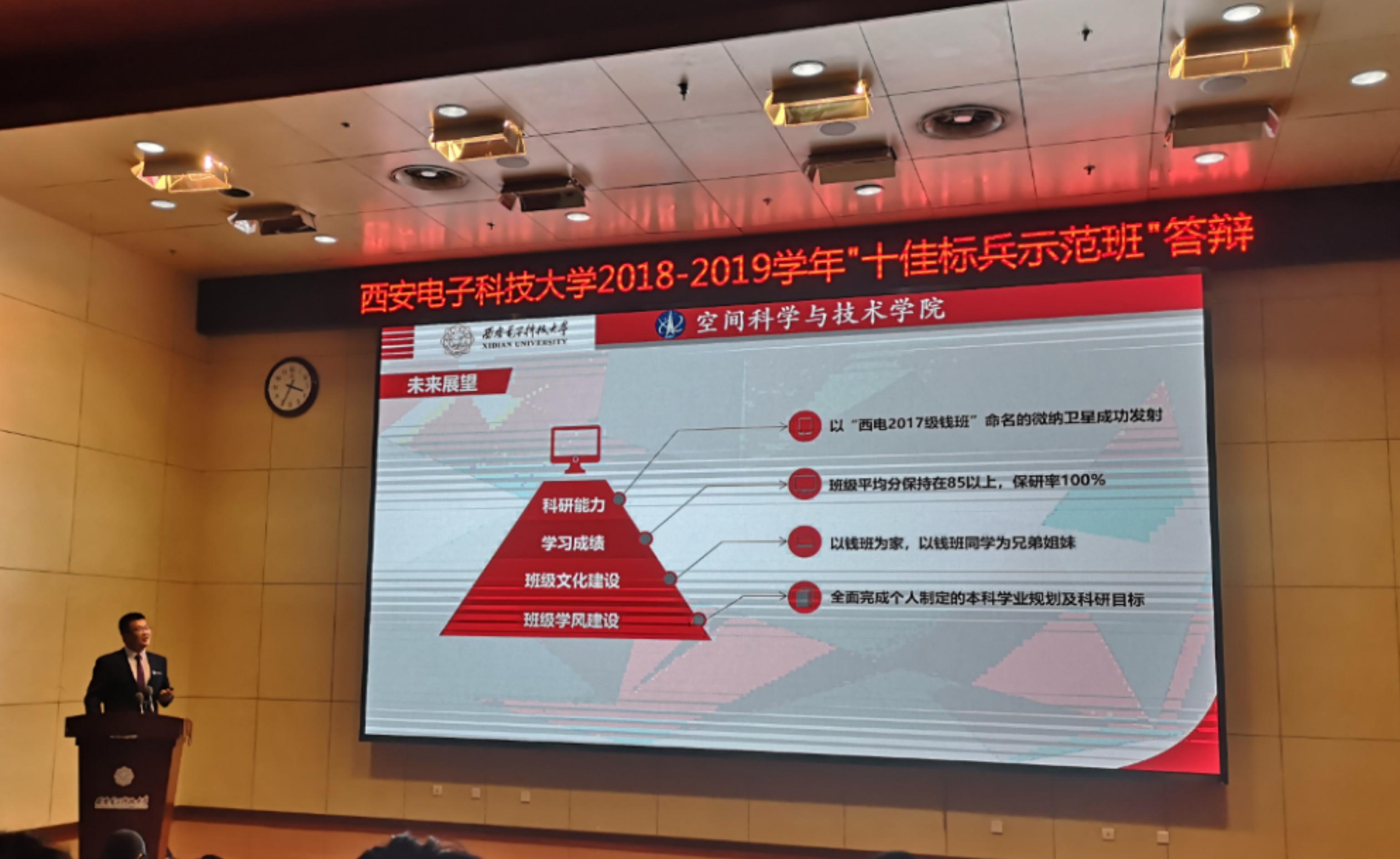 此次评选过程中,2017级钱学森班班长楚昊宁代表班级进行了答辩,楚昊宁从班级概况、班级建设、班级活动、荣誉集锦和未来展望五个方面向在场评委和三百余名现场观众介绍了2017级钱学森班的整体情况,答辩充分展现了钱班学子良好的精神风貌以及在学习、竞赛、实践等方面取得的优秀成绩和荣誉奖项。答辩在26名钱班学子齐声喊出“仰望星空,脚踏实地,西电钱班,创造奇迹!”的口号中结束,收获了在场师生的掌声和赞许。