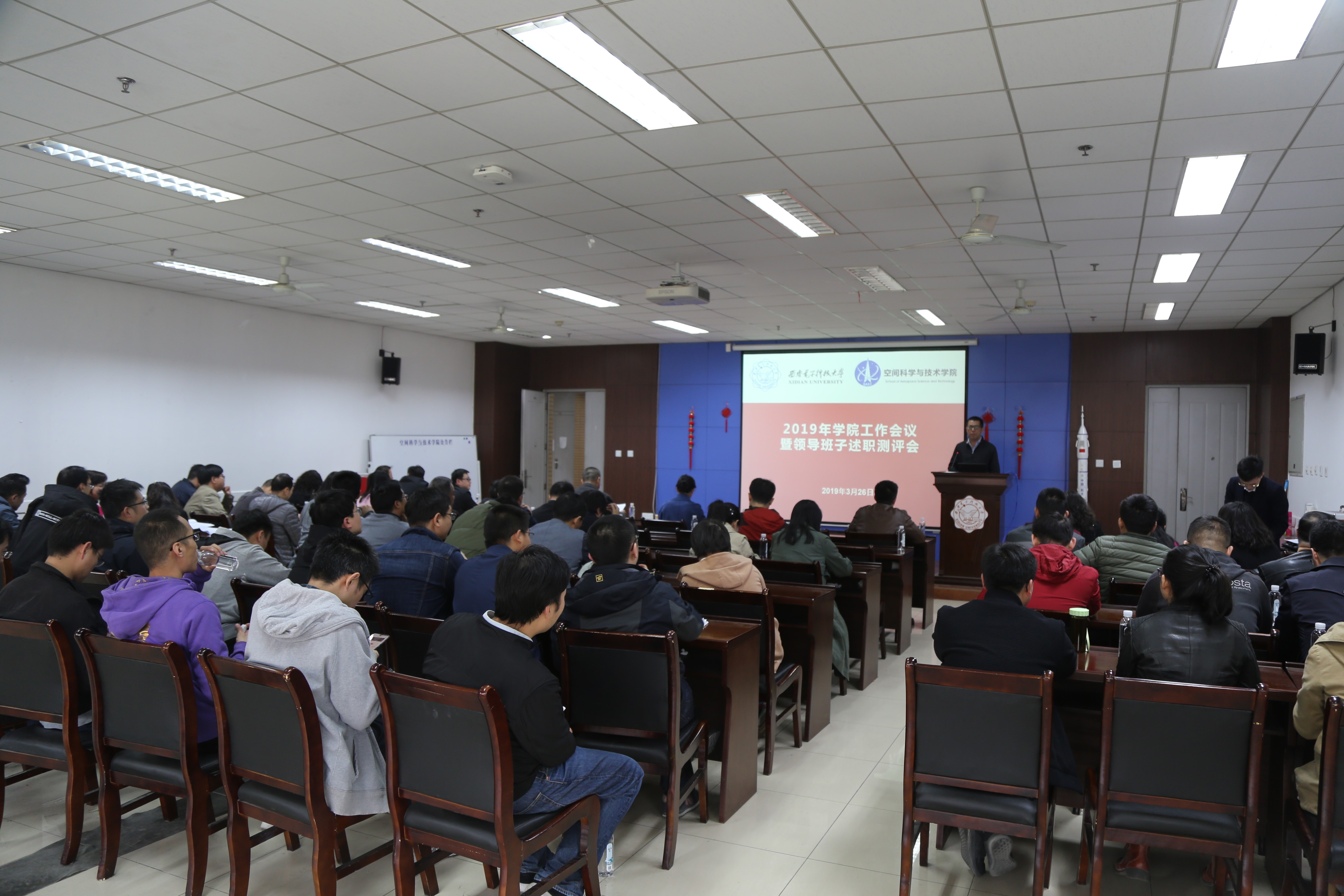 空间学院执行经理李小平对学院2018年工作进行了简要总结。2018年在全体教职工的共同努力下,在人才培养、学术科研、队伍建设、国际化工作等成绩显著,全面完成年度目标任务核心指标。在诠释学校工作会精神基础上,分析讲解了2019年度学校下达任务,详细梳理了年度工作目标,阐述了总体工作思路,计划部署了几大模块重点工作任务。她强调:2019年是“重心下移,两级管理”的变革之年,是“双一流”建设关键之年,空间学院将从团队建设、科研学术、公司产品、人事人才、制度文化、国际国内联合等方面聚焦发力,以一流学科、一流教师、一流员工、一流专业助推学院一流建设,继续保持快速全面发展,将学院建设成为在空间科学和空间电子信息领域具有牵引力、具有蓬勃活力的国内有影响力学院。