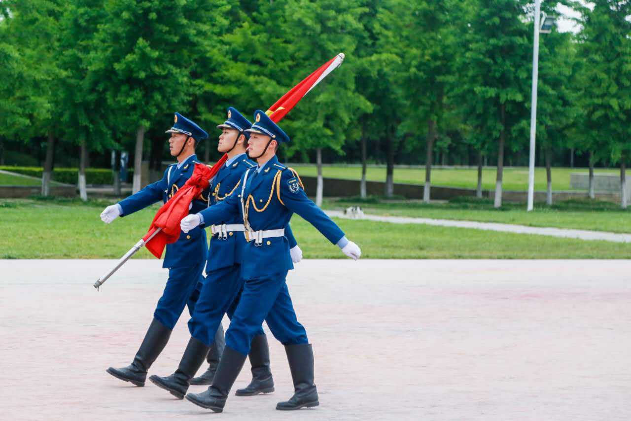 升旗伊始,在2016级本科生赵晋阳同学的主持下,分列式进行曲响起,国旗仪仗队配合着庄严的音乐,踏着整齐的步伐,缓缓护送国旗来到国旗杆下。随后,标兵站定,师生就位,国歌奏起,鲜艳的五星红旗在全体的注目礼下缓缓升起。