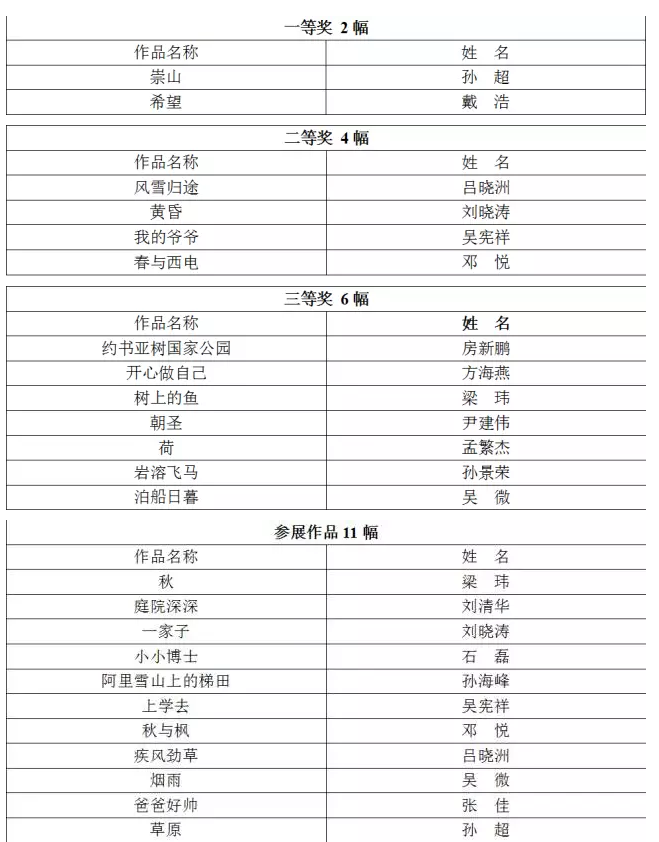 一等奖黄福荣(24)、范雪欣(2)、汤建成(21)、梁国星(相机4)二等奖冯龄慰(1)、安梓嘉(1、2)、李晨西(2)、汤建成(14、3)、梁国星相机(2)、宋迤达(相机3)三等奖汤建成(1、2、6、10、11、20)、安潇楠(2)、陈湘子(1)、范雪欣(8)、黄福荣(3)、刘双印(6)、于竞斐(6)