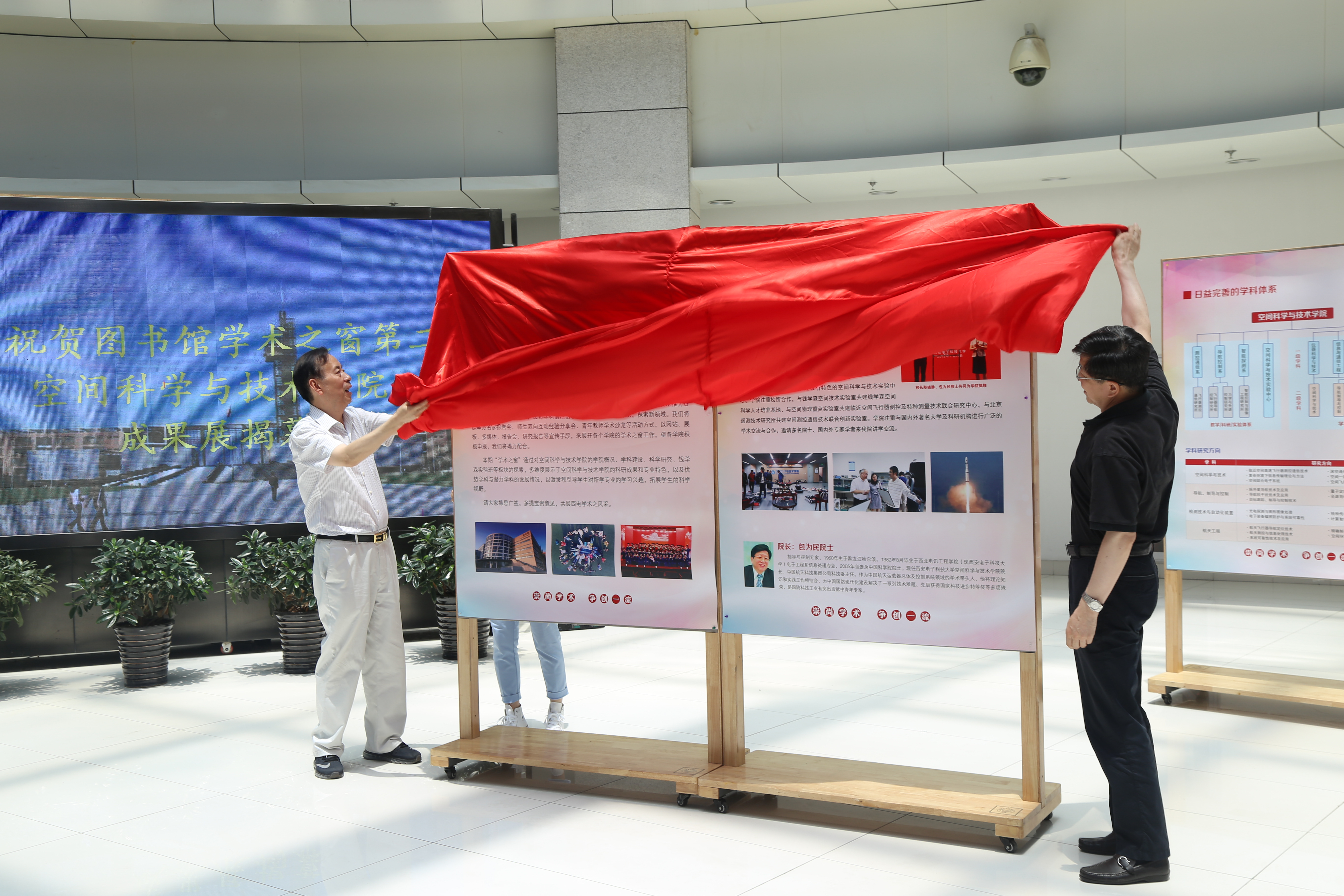 典礼开始前全体师生在图书馆大厅参加了《快速发展中的空间学院》——学术之窗揭幕仪式,郝跃院士与包为民院士共同为学术之窗系列展览揭幕。郝跃在致辞中首先对对学术之窗活动的成功举办表示了衷心的祝贺。他说:“在包为民经理的关怀与带领下,在学院全体师生的共同努力下,空间学院在自成立以来的短短几年内就在科研、教学、人才培养等各方面取得了骄人的成绩。此次学术之窗通过对tyc539太阳集团的学院概况、团队建设、科学研究、钱学森实验班等板块的探索,多维度展示了tyc539太阳集团的科研成果和专业特色,以及优势学科与潜力学科的发展情况,详细地介绍了空间学院在过去的4年中收获的丰硕成果。希望能够通过学术之窗,提高广老员工的专业认识和归属感,拓展员工的科学视野和前沿视角,并能感受和见证空间学院发展过程中的步步峥嵘。”