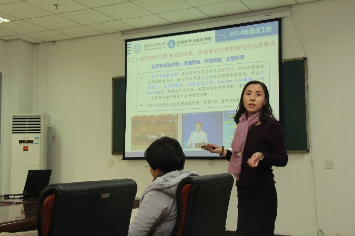 李小平教授首先对学院2014年一年的工作进行了总结,从发展规划和团队建设、员工培养和教师队伍、科研工作和科学实验平台、文化与环境建设等方面进行了简要汇报。她说,2014是学院创立之后的第一个完整年,在全体教师员工共同努力下,学院工作取得了长足进展:学院不断探索创新人才培养新模式;“钱学森空间科学实验班“正式揭牌;深化研究生教育综合改革,突出校所联合、工程问题驱动的培养模式;激励、引导与打造一支高水平教学科研团队;科学规划学院特色发展,“西电一号”微小卫星开启系统工程能力建设;增强科研创新实力,973重大项目开局良好;重基础强实践,打造多层次实验教学研究平台;加强学院文化氛围建设,打造良好学术环境等。李小平教授对2015年学院重点工作进行了计划。她表示,2015年是关键的一年,面对新的发展形势、要科学规划,抓住机遇、团结协作,努力奋斗!