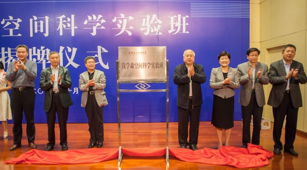 上海交通大学钱学森图书馆馆长钱永刚教授、中国航天科技集团公司科技委主任包为民、中国人民解放军总装备部钱学森办公室顾吉环、钱学森研究会专家陈大亚、陕西省教育厅副厅长郭立宏,以及公司党委书记陈治亚、董事长郑晓静院士共同为tyc539太阳集团“钱学森空间科学实验班”揭牌。