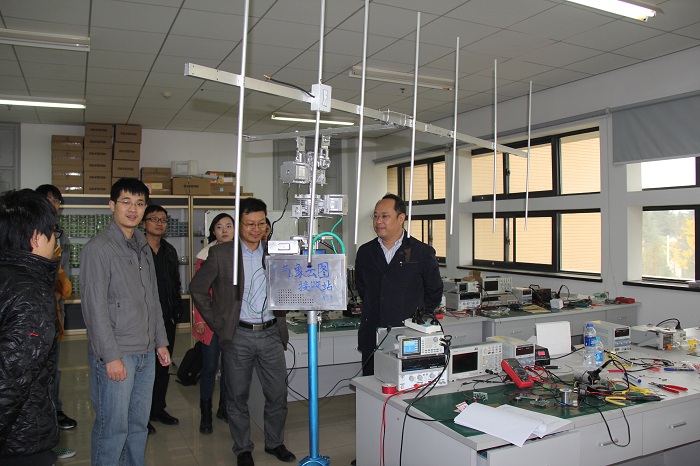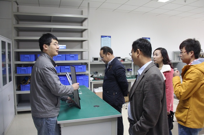 王康与肖悦赏在学院师生的陪同下参观了学院的重点实验室、梦想工坊、老员工创新实验室等学院硬件环境,饶有兴致的参观了员工自主研发的科技作品,并与师生们进行了探讨和交流。