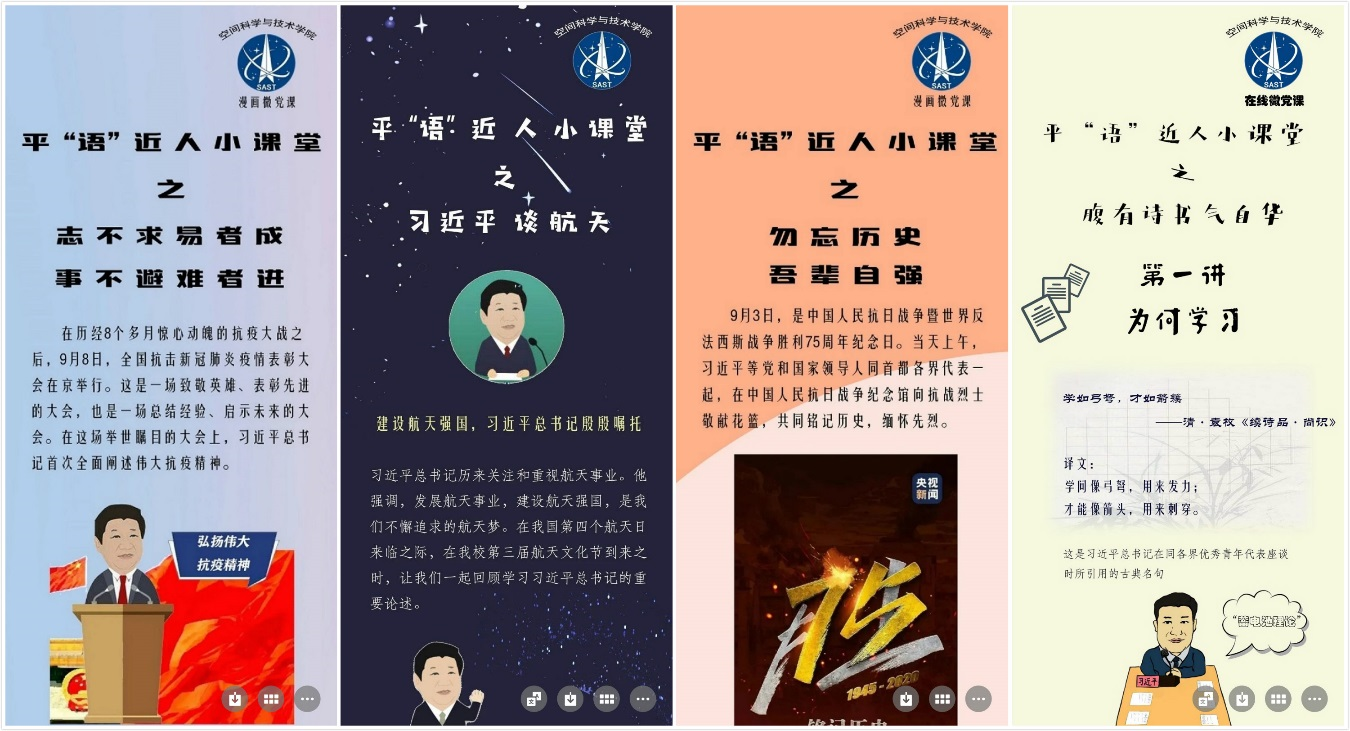 依托网络思政融媒体矩阵,学院以《平“语”近人—习近平总书记用典》为素材,结合习近平总书记重要讲话精神,持续推出《平“语”近人小课堂》漫画微党课系列,将红色文化、传统文化、校园文化有机融合,用党言党语讲政治,用新言新语谈发展,用学言学语话感悟。目前,《平“语”近人小课堂》漫画微党课系列目前已发布50期,涵盖主题教育、传统文化、量子计算、一带一路等多个热点主题,成为朋辈思政网络作品的“爆款”。疫情期间,推出战“疫”文章36篇、微党课特刊4期、微视频3期,上好线上思政战“疫”大课;开展“我为家乡代言”短视频展播推介活动,开展网络直播销售,助力脱贫攻坚。