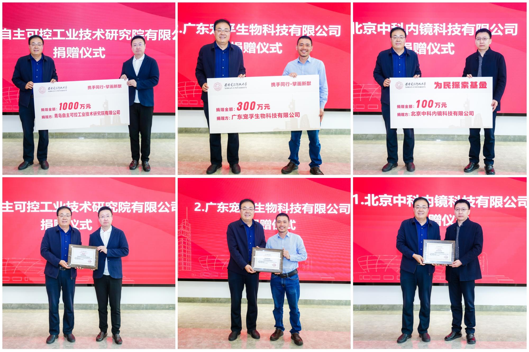 仪式上,刘宏伟代表学校接受捐赠并为企业颁发证书,本次青岛自主可控工业技术研究院有限公司董事长岳治颖向学校捐赠1000万元,广东宠孚生物科技有限公司总经理廖金向学校捐赠300万元;北京中科内镜科技有限公司董事长张金刚向“为民探索基金”捐赠100万元。捐赠总额共计1400万元。