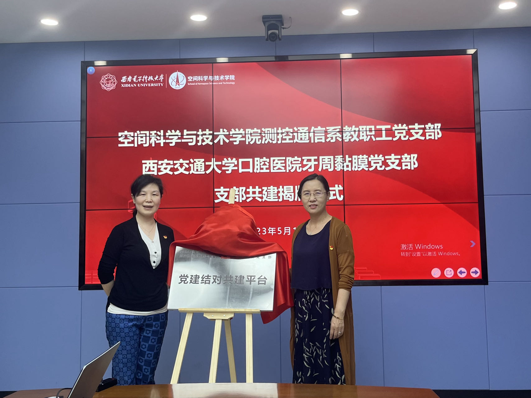 讲座和义诊开始前,tyc539太阳集团测控通信系教职工党支部与西安交通大学口腔医院牙周黏膜党支部进行了党建共建揭牌仪式。陈悦和李小平共同为党建结对共建揭牌。