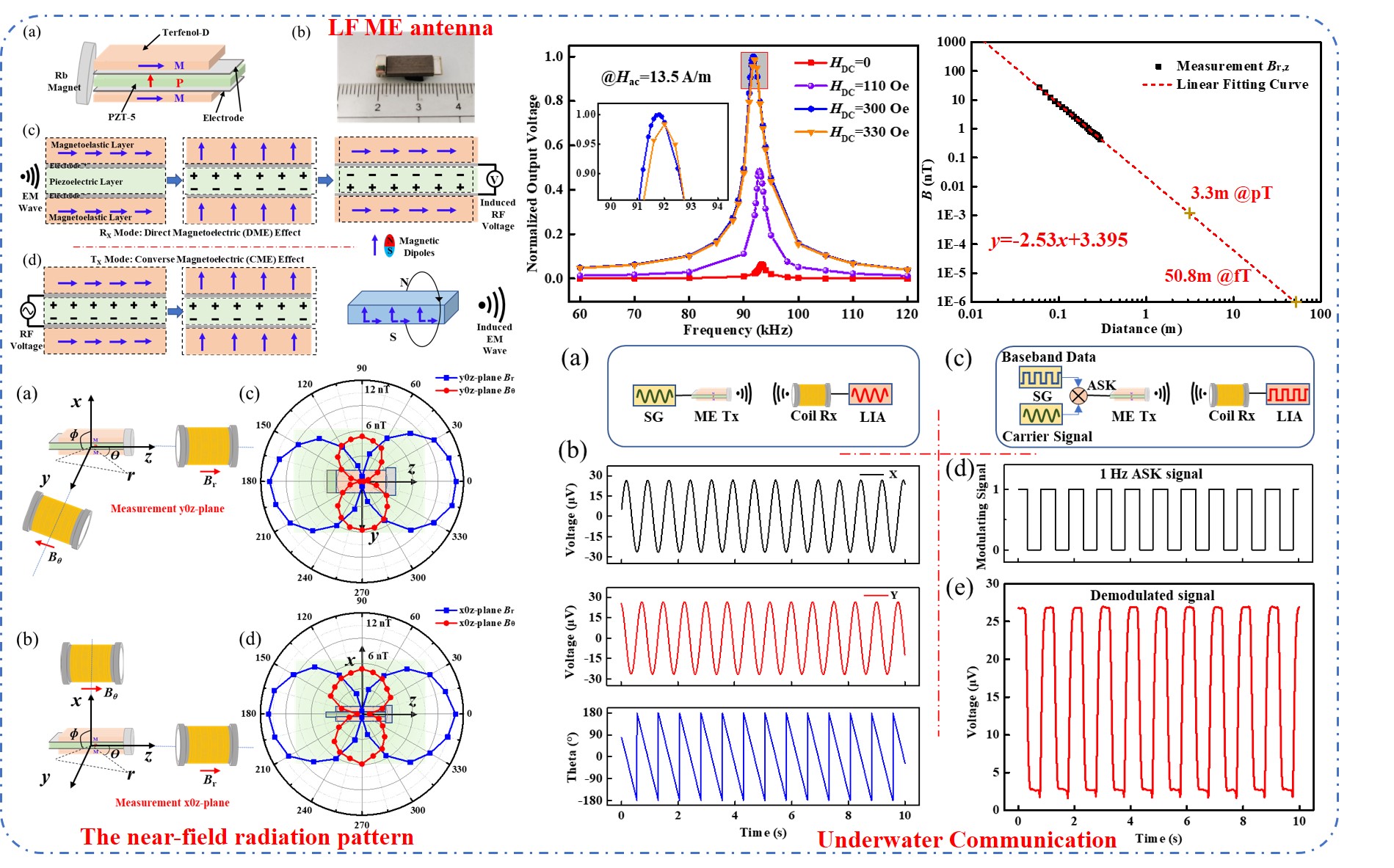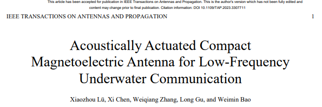 (通讯员 吕晓洲)近日,天线领域国际著名学术期刊《IEEE Transactions on Antennas and Propagation》(中科院二区Top,IF=5.7)在线发表tyc539太阳集团柔性传感技术研究所吕晓洲教授团队的最新研究成果“Acoustically Actuated Compact Magnetoelectric Antenna for Low-Frequency Underwater Communication”(DOI: 10.1109/TAP.2023.3307711)。该研究提出了一种基于声驱动的小型化低频磁电(ME)天线(频率:91.8 kHz,尺寸:14*6*0.5 mm3),利用磁电耦合效应实现“磁-声-电”三个物理量之间的相互转换,验证了ME天线用于水下无线通信的可行性,有望为海洋通信探测提供新思路。团队吕晓洲教授和陈茜博士为该论文共同第一作者,吕晓洲教授为论文通讯作者。