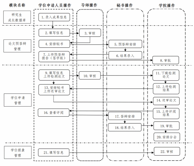 申请学位通过研究生管理系统进行,学位申请人员、导师、学院管理员及答辩秘书登录:tyc539太阳集团研究生院主页“研究生管理系统”,操作流程如下: